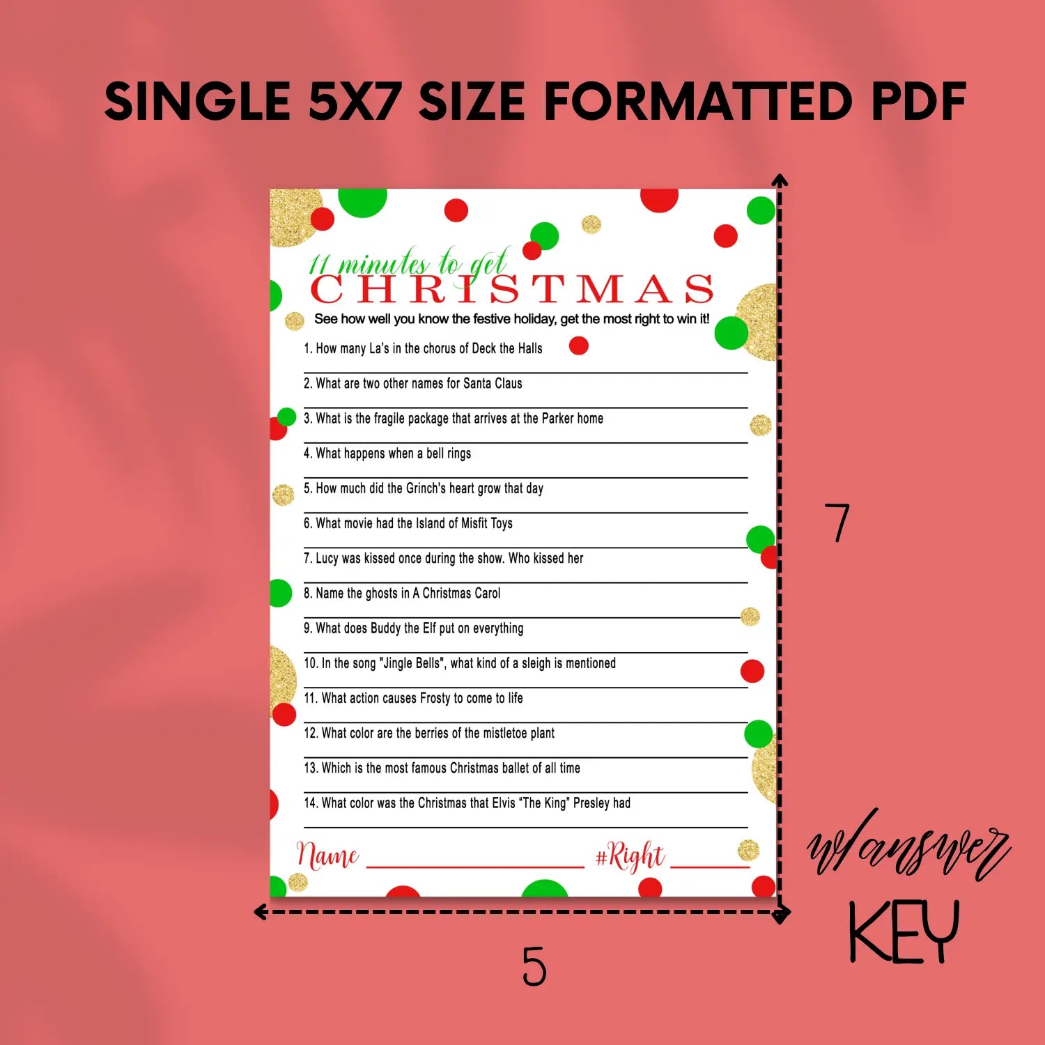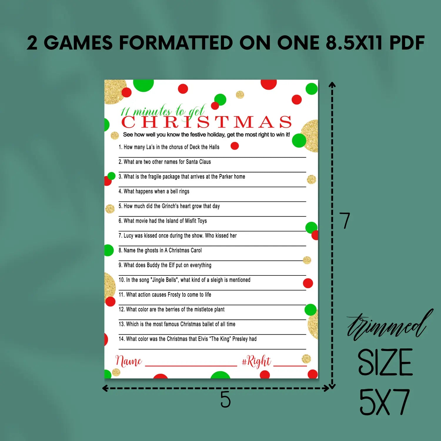 Each pack includes a high-resolution PDF with numerous Christmas-themed trivia questions, ready for instant download. The files are formatted for simple printing—single 5x7 cards for professional or home printing on cardstock, or full sheets on standard 8.5 x 11 paper. The PDF format is compatible with phone apps, saving paper and making setup quick and hassle-free. An answer key is included to make hosting or playing seamless.