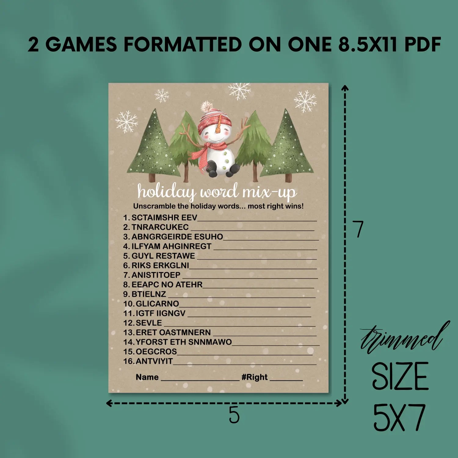Get into the holiday spirit with our cheerful Christmas Word Scramble game! This fun and festive printable set features charming holiday-themed designs and is perfect for personal use at your Christmas gatherings. Instantly downloadable as a high-quality PDF, these games are ideal for printing at home or your favorite print shop.