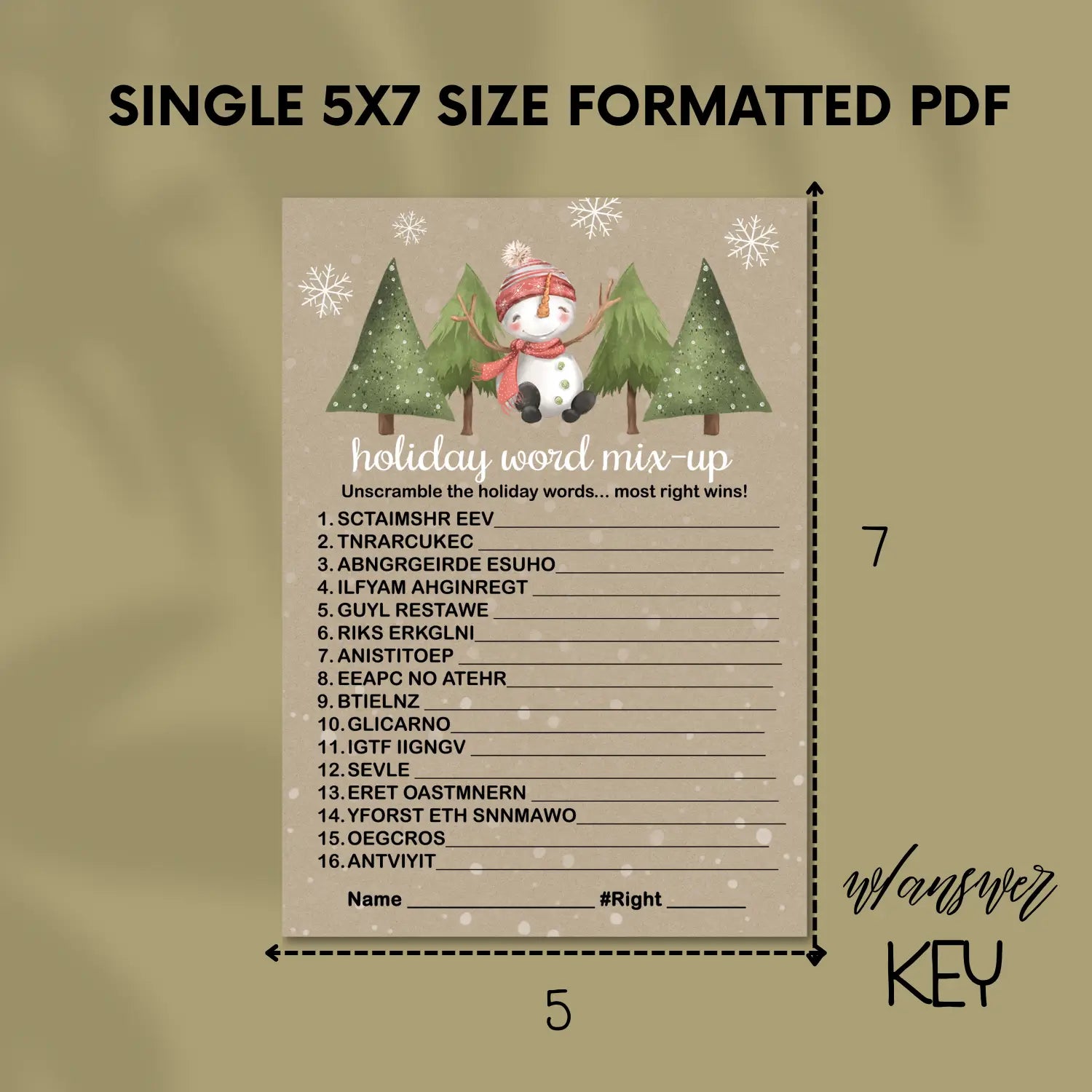 Snowman Christmas Word Scramble Printable – Digital Download Rustic Snow Design, Instant Download