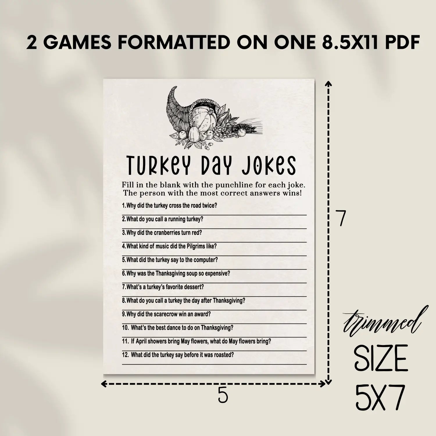 Each pack includes a high-resolution PDF with multiple trivia questions, ready for instant download. The files are formatted for easy printingβsingle 5x7 cards for professional or home printing on cardstock, or full sheets on standard 8.5 x 11 paper. The PDF format is compatible with phone apps, saving paper, time, and making setup quick and effortless. An answer key is included, so hosting your Thanksgiving trivia has never been easier.