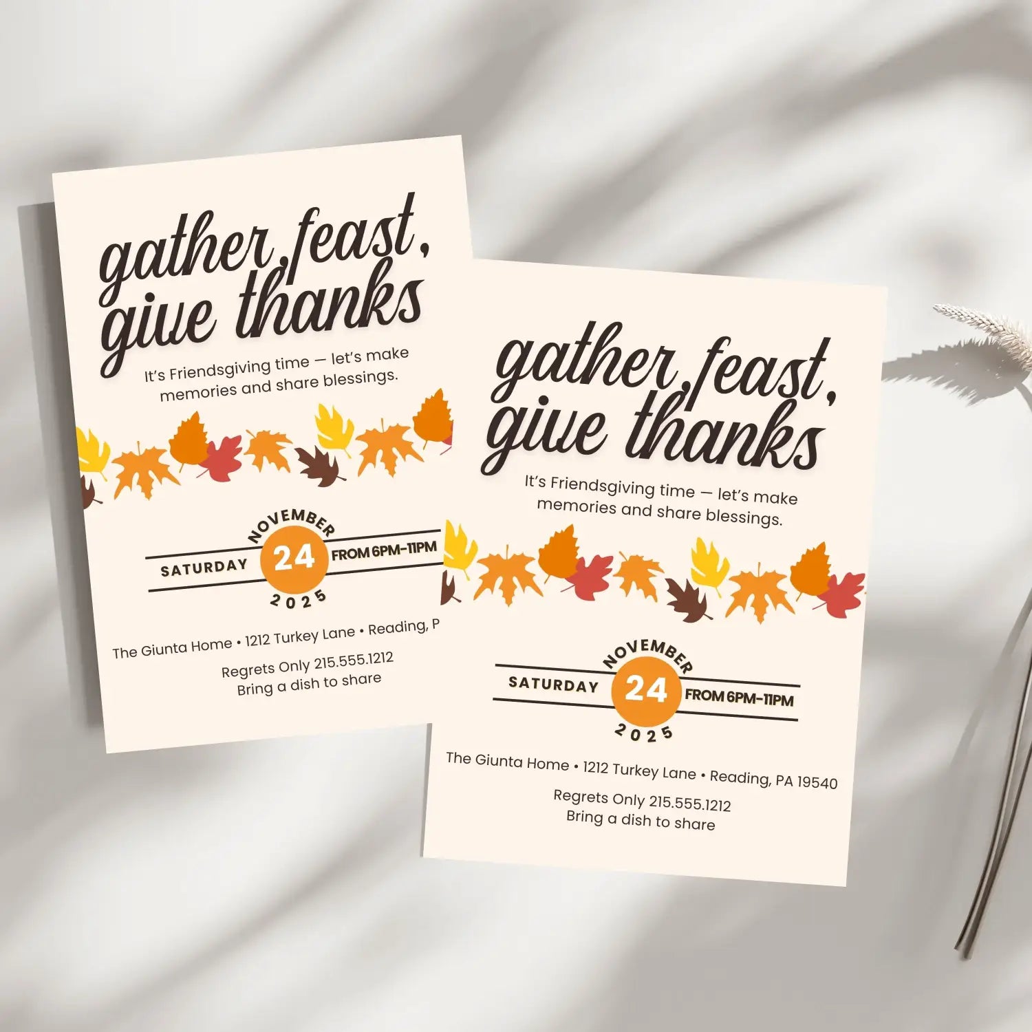 Perfect for celebrating gratitude with friends and family, these invitations are available as stunning digital files for DIY printing or professionally printed cards with envelopes—designed to match any fall theme or style.